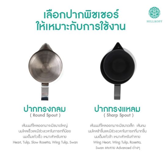 - ปากทรงกลม ( Round Spout ) เส้นนมที่ไหลออกมาจะมีขนาดใหญ่ นมไหลเร็วและมีช่วงเวลาในการเทที่น้อย นมเต็มแก้วเร็วขึ้น เหมาะสำหรับลาย Heart, Tulip, Slow Rossetta, Wing Tulip, Swan