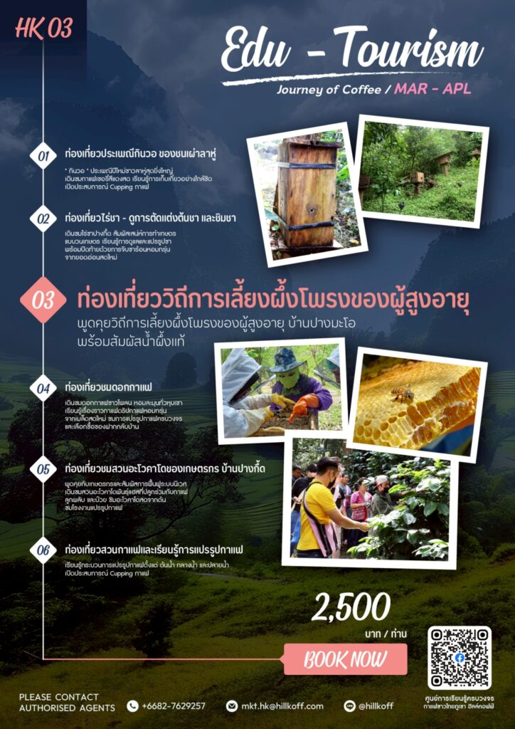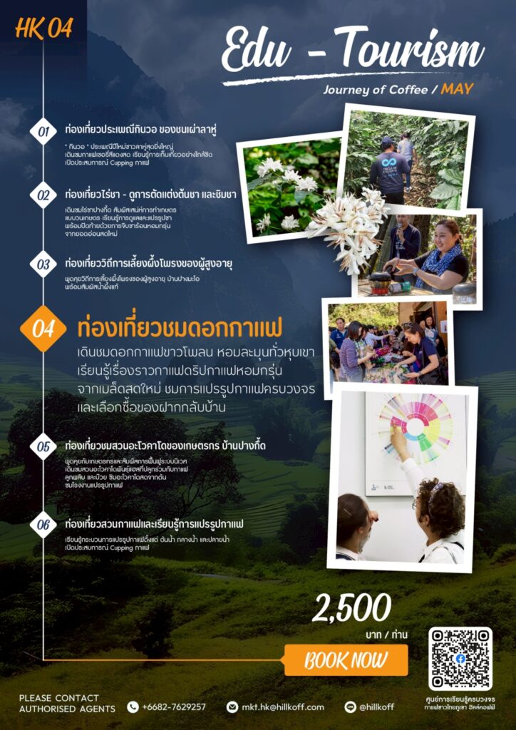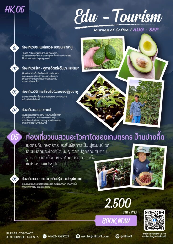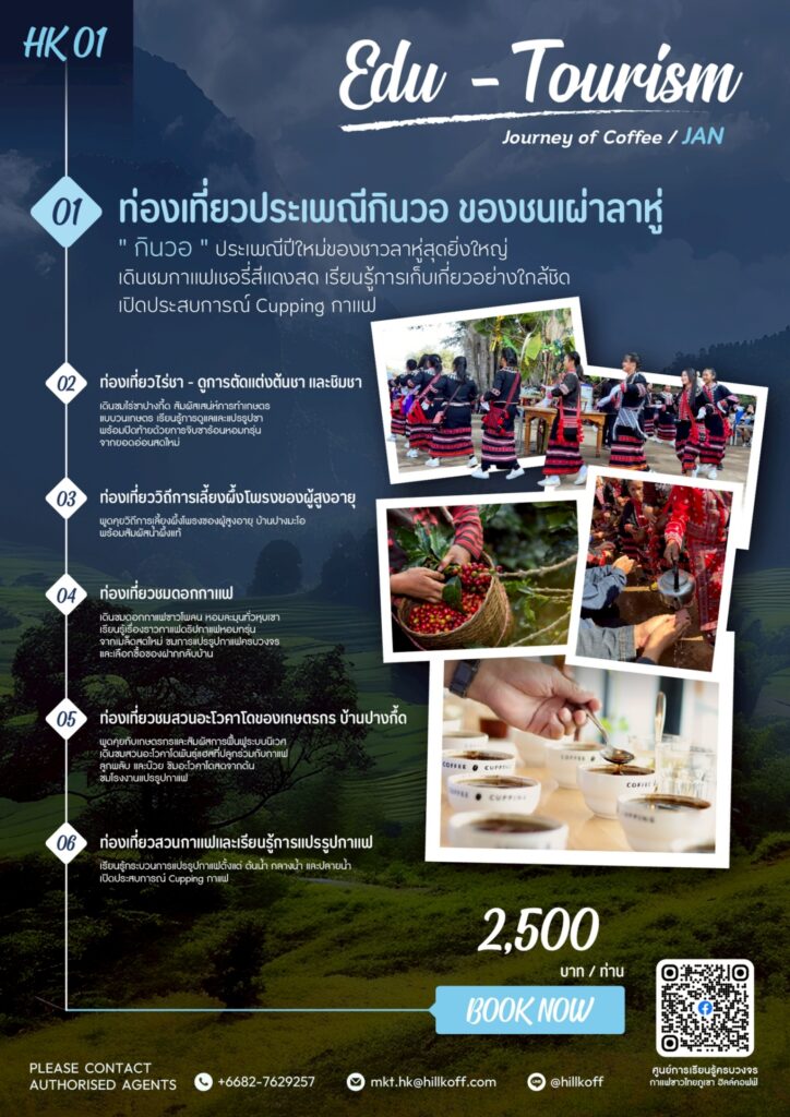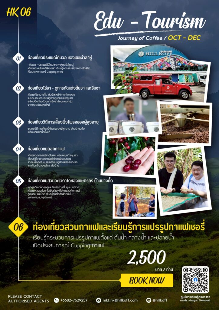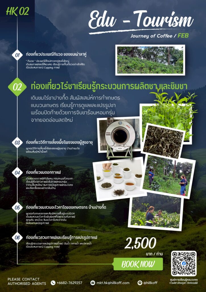 COFFEE JOURNEY หากคุณเป็นผู้ชื่นชอบการเดินทางและรักกาแฟ แหล่งเรียนรู้ชาวไทยภูเขาเป็นสถานที่สุดพิเศษที่คุณสามารถผสมผสานความหลงใหลทั้งสองอย่างเข้าด้วยกัน ศูนย์เรียนรู้แห่งนี้ตั้งอยู่ใจกลางเนินเขาที่งดงามมอบโอกาสพิเศษในการเจาะลึกโลกแห่งกาแฟไปพร้อมๆ กับการดื่มด่ำไปกับความงามของธรรมชาติโดยรอบ ท่องเที่ยวเรียนรู้โลกของกาแฟที่ศูนย์การเรียนรู้ครบวงจร กาแฟชาวไทยภูเขา เปิดประสบการณ์ใหม่ของคนรักกาแฟที่จะพาคุณไปสัมผัสโลกของกาแฟให้มากขึ้นตั้งแต่จุดเริ่มต้นจนถึงจุดจบของธุรกิจกาแฟกับแนวคิด CIRCULAR ECONOMYที่นำวัตถุดิบจากทุกกระบวนการมาดัดแปลงทำงานวิจัยใช้ประโยชน์ได้มากที่สุด COFFEE CAMP _ Coffee Camp หอมไกลชลบุรี Hillkoff Coffee Camp 2020 & CP All Coffee Camp CP All ครั้งที่ 2 HILLKOFF EXPERIENCE SPACEแผนผังศูนย์การเรียนรู้ครบวงจร กาแฟชาวไทยภูเขา ฮิลล์คอฟฟ์ รายละเอียดการแสดงแผนผังศูนย์การเรียนรู้ครบวงจรกาแฟชาวไทยภูเขา ฮิลล์คอฟฟ์1. ศาลกู่ทัพ2. อุโมงค์ตากกาแฟ / โรงเรือนปลูกพืช3. สมาร์ทโดมพลังงานแสงอาทิตย์4. บ้านน้องบัฟ5. สวนกล้วยน้ำว้า6. ร้านกาแฟ / ห้องเรียนรู้กำเนิดกาแฟอราบิก้าไทย7. สวนกาแฟโรบัสต้า / ลิเบอร์ลิก้า8. สวนชมพู่ / สวนกาแฟ9. สวนอินทผลัม10. บ่อบำบัด / บ่อปุ๋ยน้ำ11. อาคารลูกสน12. สถานีก๊าซ13. สวนมะม่วง / หมากแดง14. สวนเกษตรผสมผสาน ในระบบอินทรีย์จากปุ๋ยกาแฟหมัก15 .WET MILL อาคารแปรรูปกาแฟสด16. DRY MILL อาคารแปรรูปกาแฟแห้ง (A)17. WARE HOUSE อาคารโกดัง (B)18. ROASTING PLANT อาคารคั่วกาแฟ19. สำนักงาน (D)20. บ่อเม็ดถั่ว21. บ่อมรกต22. บ้านบนดอย23. บ้านตีนดอย24.- 26. ประตู 1 มาร่วมเรียนรู้และสัมผัสโลกของกาแฟได้ที่ ศูนย์การเรียนรู้ครบวงจรกาแฟชาวไทยภูเขา ฮิลล์คอฟฟ์ตั้งอยู่ห่างจาก อ. เมืองเชียงใหม่ ประมาณ 30 นาที ศูนย์การเรียนรู้ครบวงจร กาแฟชาวไทยภูเขา ที่อยู่ 206 หมู่ที่ 9 ต.อินทขิล อ.แม่แตง จ.เชียงใหม่ 50150โทร. 093 137 1177 สนใจติดต่อ บริษัท ฮิลล์คอฟฟ์ จำกัด (สำนักงานใหญ่)ที่อยู่ 199/666 หมู่ที่ 9 ต.สันผีเสื้อ อ.เมืองเชียงใหม่ จ.เชียงใหม่ 50300 โทร. 053 231 029